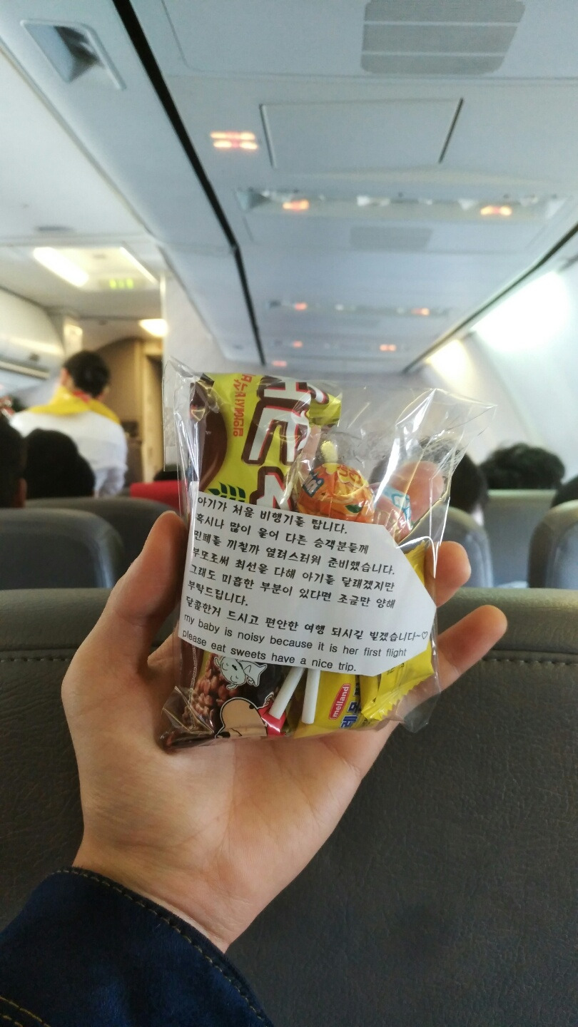 아이와 함께 처음 비행기를 타고 여행을 간다는 부부가 내 뒷자리에 앉았기 때문이다. 그 부부 주위에 앉아있는 모든 승객은 전날 밤 정성스럽게 준비한 뇌물?을 모두 받았다.