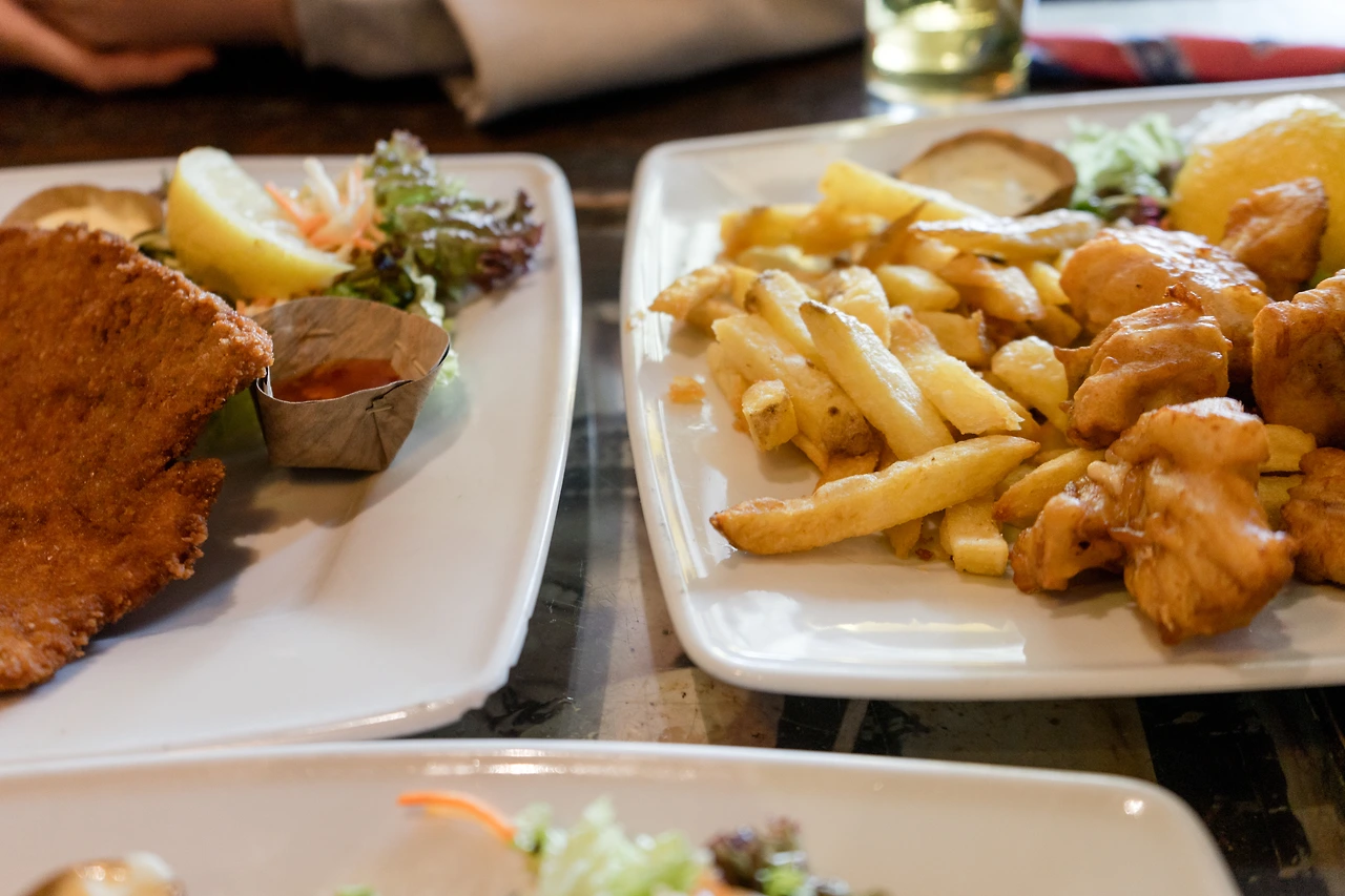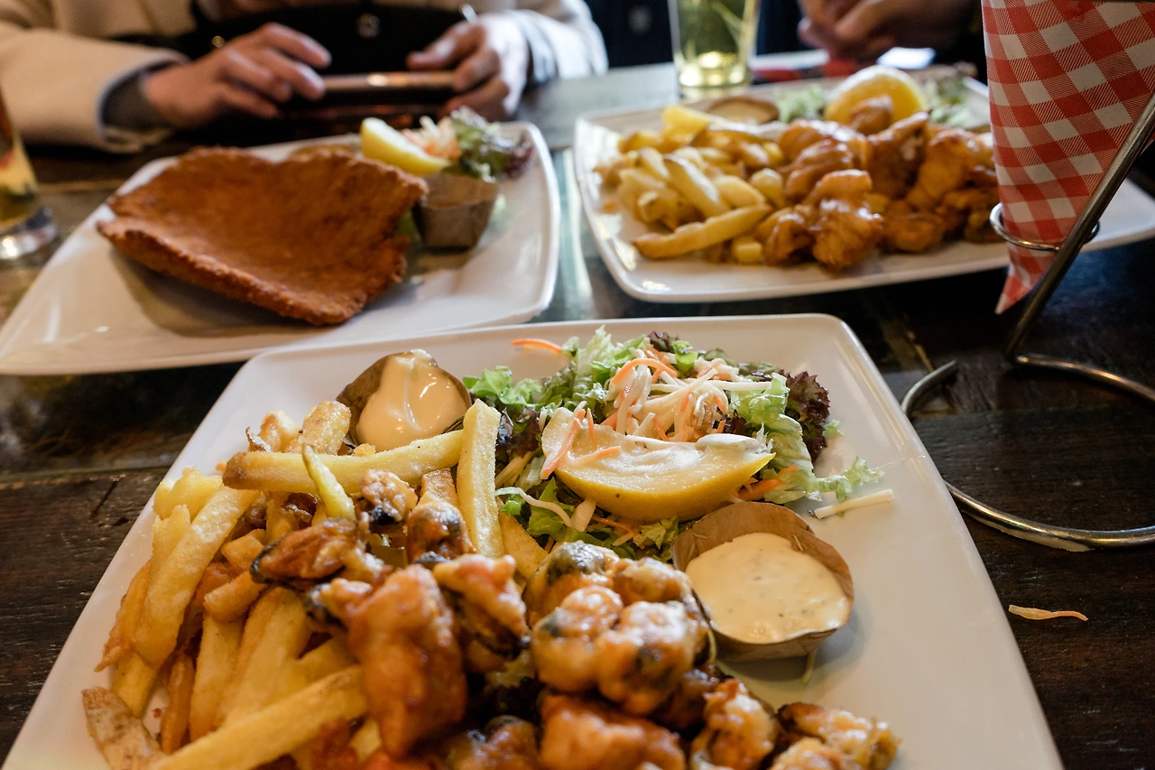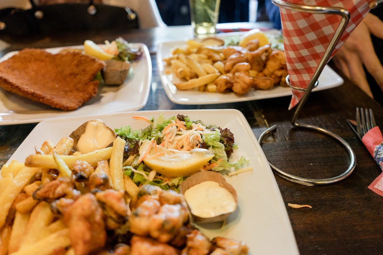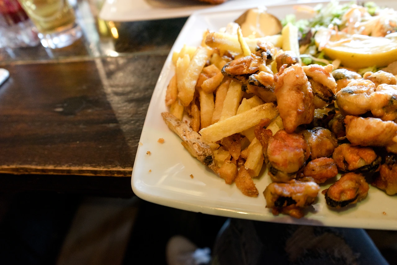 첫 번째로 나온 음식은 감자튀김과 샐러드 그리고 홍합을 튀긴 요리