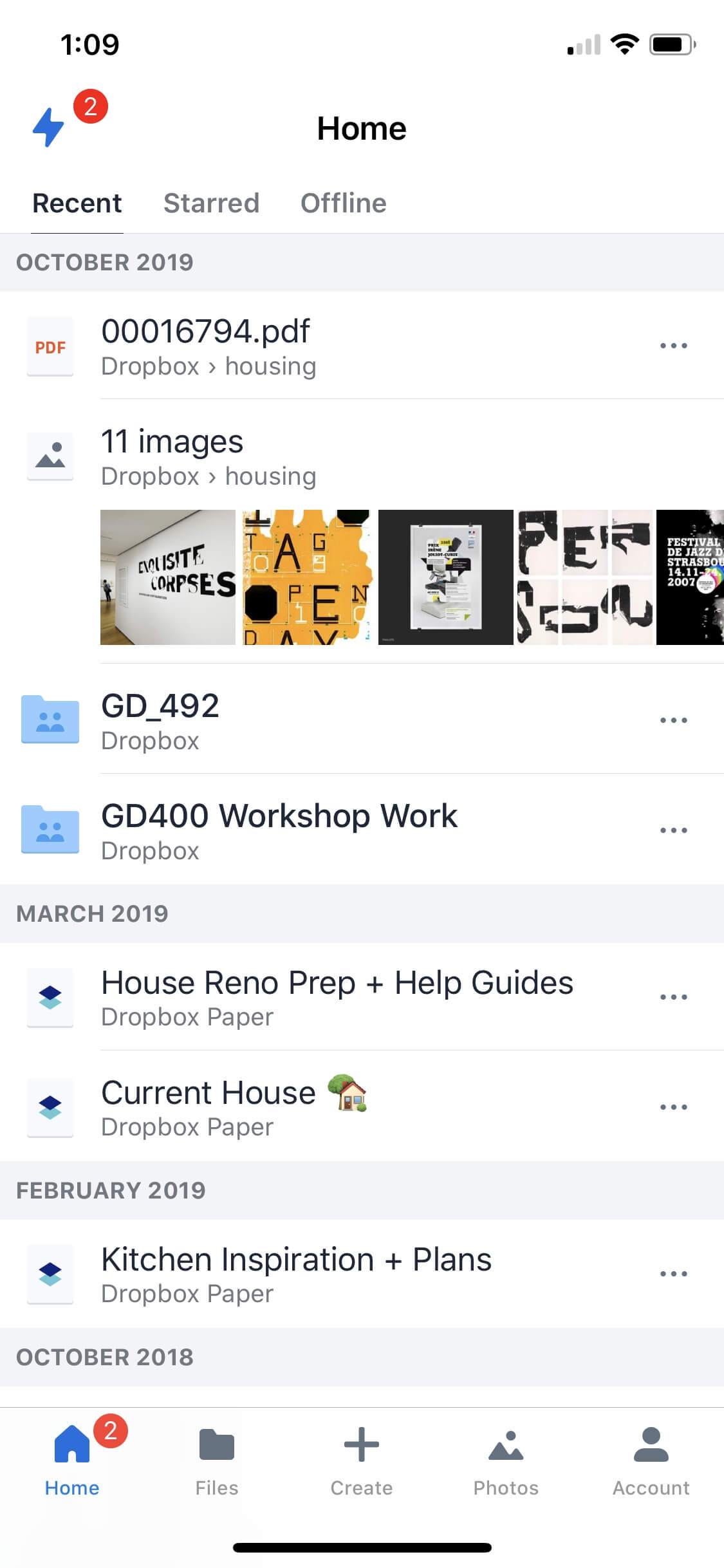 드롭박스 모바일 앱 : 드롭박스 앱은 다소 위계가 약한 모습입니다. 설명이 파일명 보다 아래 위치해 있지만, 다른 파일들 간의 다름을 분간하기엔 좀 어렵습니다. 이미지 썸네일이 레이어에 또 다른 위계를 주고 있지만, 파일 타입에 따라 썸네일 유무가 다릅니다. 따라서 사용자는 폴더나 파일을 찾을 때 하나하나씩 읽어보고 의미를 파악해야 할 것입니다.