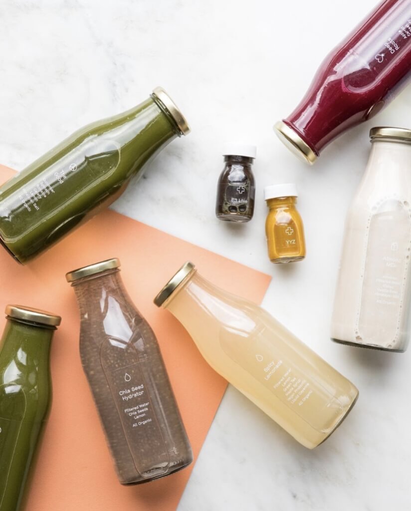 Greenhouse Juice Co: 병에 담긴 음료의 색상에 따라서 병에 적힌 텍스트의 가독성이 달라집니다. 어떤 주스의 경우에는 대비가 완벽하지만, 흰색이나 밝은 색상의 주스의 경우에는 거의 읽는 게 불가능합니다.