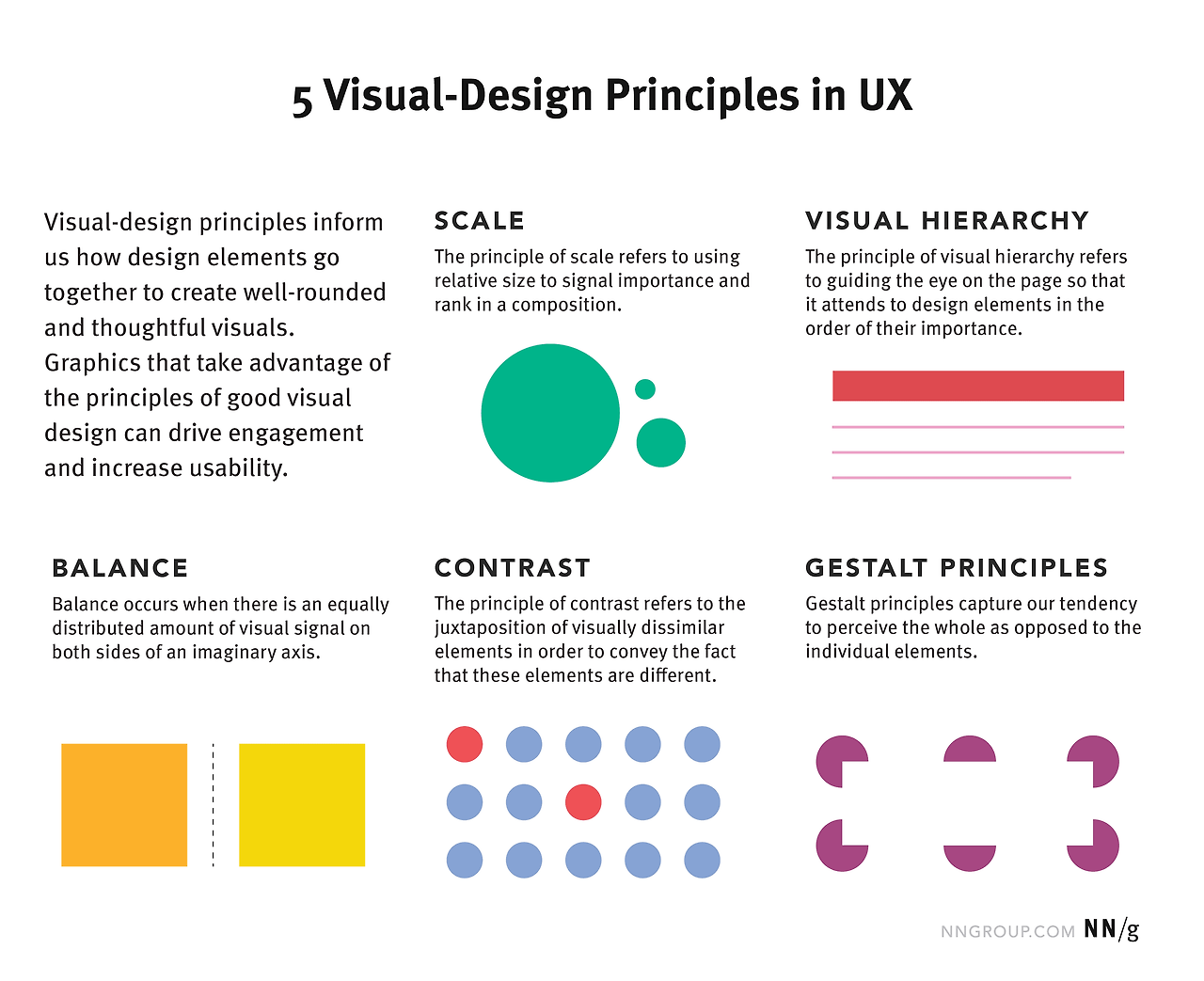 요약 : 스케일(Scale), 시각적 위계(hierarchy), 균형(Balance), 대비(Contrast) 그리고 게슈탈트(Gestalt). 이 다섯 가지 원칙은 올바르게 적용되었을 때 심미적으로 아름다울 뿐만 아니라 사용성을 높여줍니다. By Kelley Gordon on March 1, 2020