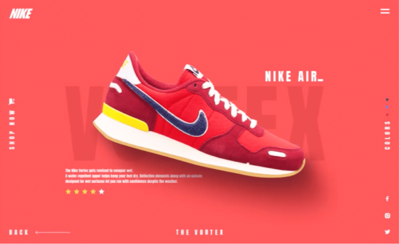 나이키 : 비대칭 균형의 페이지는 에너지와 움직임과 같은 느낌을 전달하는데 나이키와 같은 브랜드와 잘 어우러집니다. 마찬가지로 중앙에 선을 그었을 때, 축을 기준으로 양 사이드의 디자인 요소 숫자들이 비슷합니다. 하지만, 모두 동일한 것은 아니며 정확히 같은 위치에 놓인 것도 아닙니다. 정확히는 신발 왼쪽에 조금 더 많은 텍스트들이 있지만, 우측 상단의 텍스트가 더 많은 영역과 굵직한 비주얼을 차지하고 있기 때문에 균형감을 가져갈 수 있습니다.