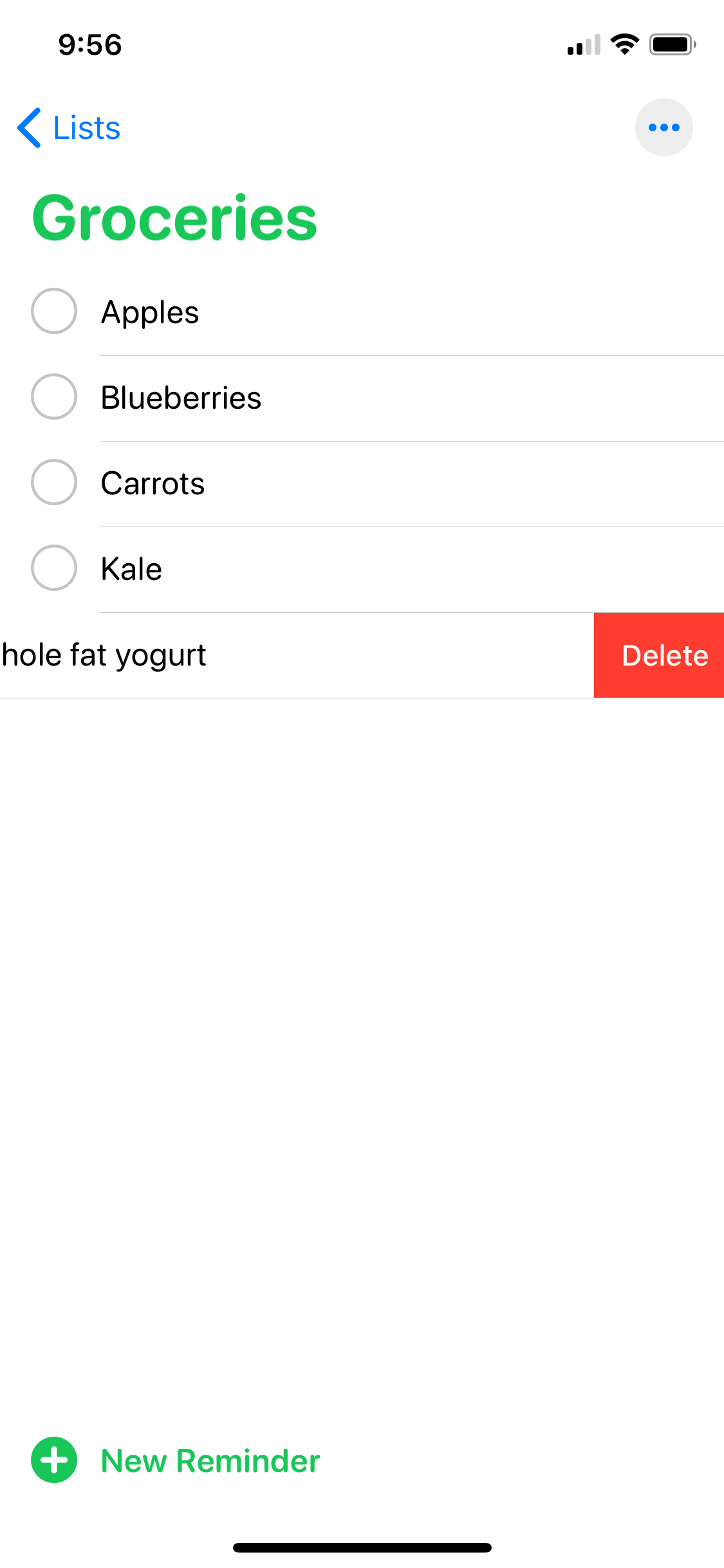iOS 리마인더 : 주변 맥락으로 봤을 때, 다른 요소들 보다 레드컬러가 훨씬 콘트라스트가 높고 삭제라는 의미를 전달한다. 종종 UX에서 "Contrast"라는 단어는 텍스트와 배경 사이의 대조를 떠올리게 합니다. 때로 디자이너들은 텍스트 강조를 위해서 의도적으로 텍스트 대비를 줄이기도 하는데, 이러한 접근은 위험합니다. 텍스트 대비를 줄이면 가독성이 저하되고 콘텐츠를 제대로 읽기 어려워집니다. 색상 대비 검사를 통해 모든 타겟 유저들이 콘텐츠를 볼 수 있도록 해야 합니다.