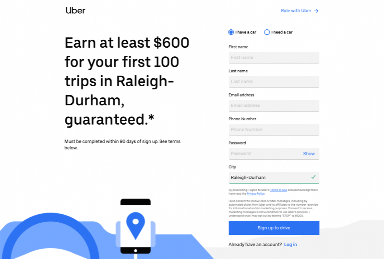 우버의 회원가입 포맷도 게슈탈트의 근접성 이론을 따릅니다. 입력 창과 그에 대한 타이틀이 서로 가까이 붙어 있어 어떤 정보를 기입해야 하는지 쉽게 이해할 수 있습니다. 입력창과 타이틀이 멀찍이 떨어져 있었다면, 어떤 칸에 무슨 정보를 써야 할지 헷갈릴 것입니다.