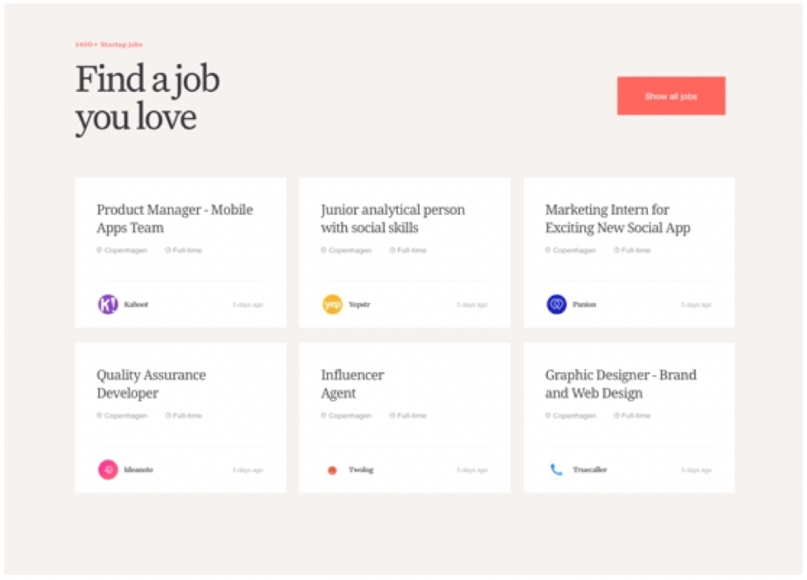 허브 스타일의 탐색 : 구성 요소가 안정적으로 느껴지며, 특히나 좋아하는 직업을 찾을 때 적합합니다. 여기서는 대칭적인 균형을 활용했습니다. 화면에 수직으로 가상의 선을 그었을 때, 양쪽이 균등하게 분배되는 걸 볼 수 있습니다.