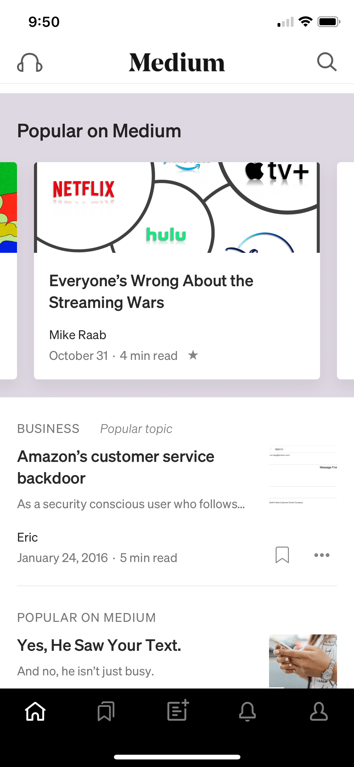 아이폰에서 보는 메디엄 Medium for iPhone : 인기 있는 아티클이 다른 아티클보다 사이즈가 큽니다. 유저들에게 더 흥미로운 아티클을 강조해 주는 역할을 합니다.