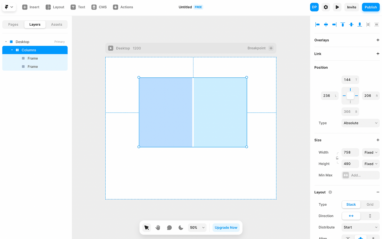 피그마나 다른 디자인툴을 써봤다면 금방 익힐 수 있다. 피그마 Auto Layout과 Component와 비슷한 개념인 Stack과 Frame이 있고 비교적 빠르게 홈페이지로 배포를 할 수 있다. 확실히 노코드라는 이름에 걸맞는 툴.
