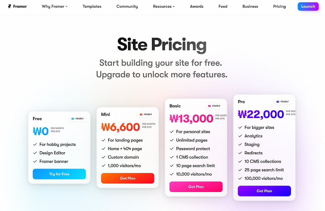 그러고 보니 프레이머는 한국이라고 금액을 won으로 표시하지맘 webflow는 달러로 표기함. UX에 있어서 전반적으로 Framer가 굉장히 더 유저 친화적임을 알 수 있는 사소한 부분
