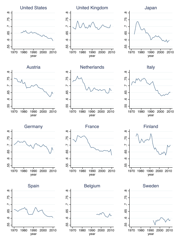 그런데 1980~90년 대를 기점으로 이렇게 견고해 보였던 사실이 흔들리는 것처럼 보였다. 미국뿐만이 아니라 프랑스, 이탈리아, 핀란드 등 여러 국가들에서 노동의 몫으로 돌아가는 비율이 줄어들기 시작했기 때문이다. (유명 학술지에 한국 데이터는 잘 없기도 하고 한국의 경우 아직은 논란이 있기 때문에 자료를 넣지 않았다)