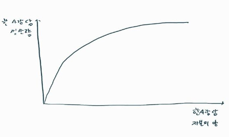 그런데 과연 한 사람이 가지고 있는 자본이 늘어난다고 생산량이 무한정 늘어나게 될까? 여기서 똑같은 문제에 부딪히게 된다. 자본이 늘어난다면 생산량은 늘어나겠지만 늘어나는 양이 점점 줄어들게 될 것이다. 자본의 한계 생산성이 하락하는 것이다. 혼자서 씨앗 10kg을 농사지을 때보다 20kg을 농사지을 때 생산량은 늘어나겠지만 두 배가 되지는 않을 것이다. 결국 자본을 증가하는 방법만으로는 생산을 늘리는 데에는 한계가 있다.