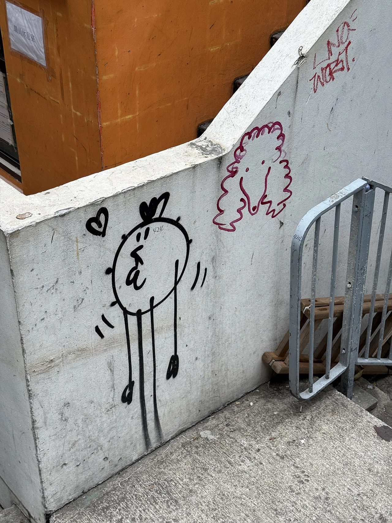 이 순간에는 지도는 잠시 내려두고 가고 싶은 방향대로 홍콩을 구경하면서 걸어갔다. 울창한 덩굴로 뒤덮인 건물도 보고 초등학교도 구경했다. 한국의 초등학교와는 굉장히 다른 건물의 느낌이어서 차이점도 찾으면서 신나게 걸어갔다. 어떤 것들이 나올지 모르니 더 흥미로웠다. 무계획 여행의 장점이지 않을까~? 건물들 곳곳을 구경하면서 걷다가 지하철역 표지판이 보여서 표지판을 따라가면 호텔 근처로 향할 거 같아서 그쪽으로 향했다. 계단을 쭉 내려가다 보니 벽화에 다양한 그림이 그려져 있었다. 귀여운 그림도 발견해서 사진도 찍었다. 홍콩은 벽 곳곳에 거리마다 귀여운 그림들이 그려져 있어서 찾는 재미도 있는 거 같다.