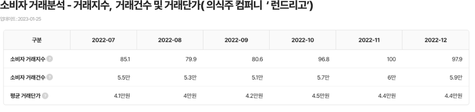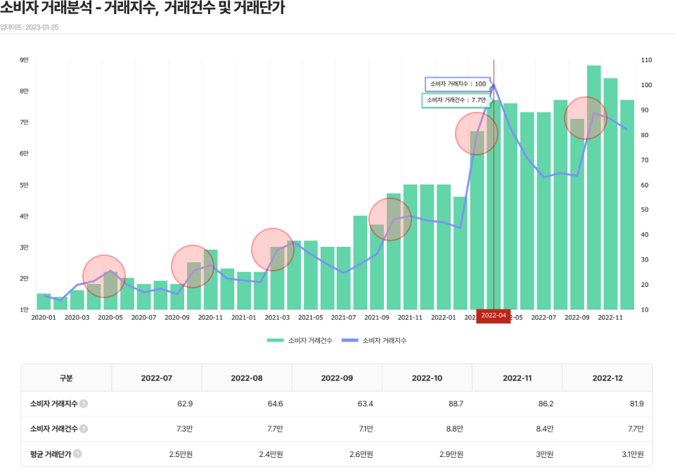 2020년부터 J자 커브를 그리며 급격히 상승하던 소비자 거래지수는 2022년 4월 최댓값 100을 달성한 뒤 하락세를 보이다 9월을 기점으로 다시 반등하고 있는 추세이다. 이는 2020년부터 그래프를 보았을 때 봄과 가을에 상승세를 보이는 것으로 보인다. (그래프상에 붉은색 원으로 표시함) 내 생각으로는 봄과 가을에 상대적으로 세탁에 대한 수요가 많은 성수기이지 않을까 하는 가설을 세워본다. 소비자 거래건수 역시 소비자 거래지수와 마찬가지로 봄과 가을에 상승하고, 여름과 겨울에 다시 하락하는 추세를 보인다.