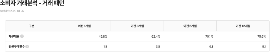그다음으로 소비자의 거래패턴에 대해서 알아보면 소비자들의 재구매율과 평균 구매 횟수는 이전 1개월에서 시점을 과거로 갈수록 당연히 늘어나는 모습을 보였는데, 이전 12개월 기준 75.6%, 9.1회로 나타났다.