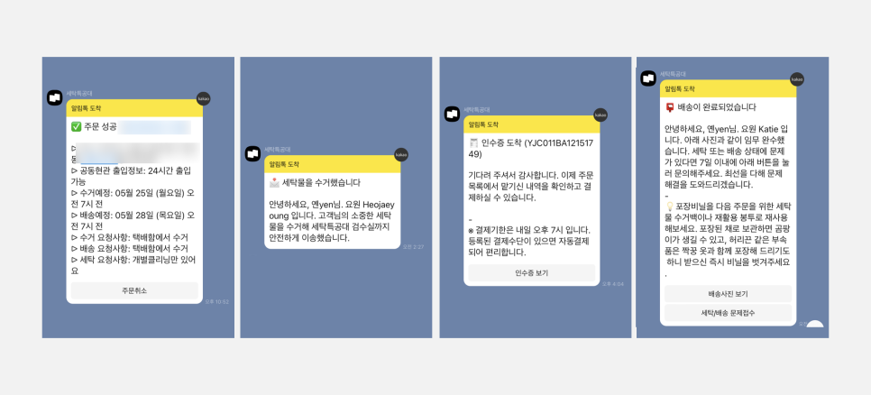 세탁 주문 및 배송까지의 과정을 기존의 카카오톡 전송 이외에 앱 내에서도 확인