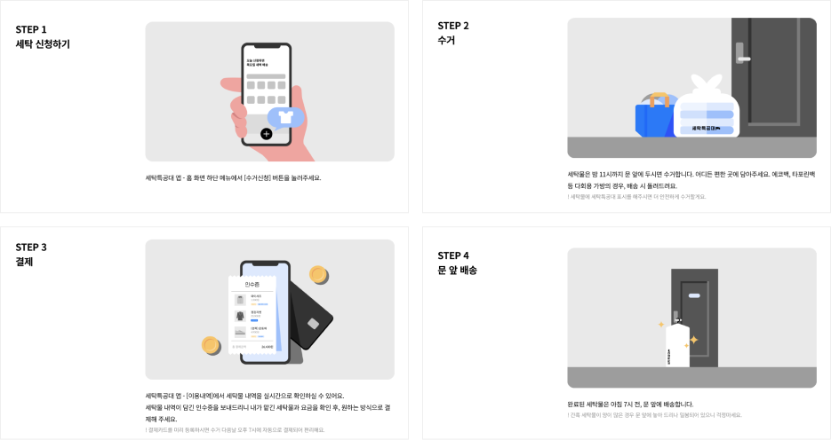 우리가 기존의 오프라인 세탁소에 세탁을 요청할 때 말하지 않아도 꼼꼼하고 깔끔하게 해 주고, 또 특별히 요청한 부분에 더 신경 써서 확인해 주는 세탁소에 계속 맡기듯 비대면 모바일 세탁 서비스 역시 믿을 수 있고 마음 편안한 서비스 이미지가 되어야 할 것이다.