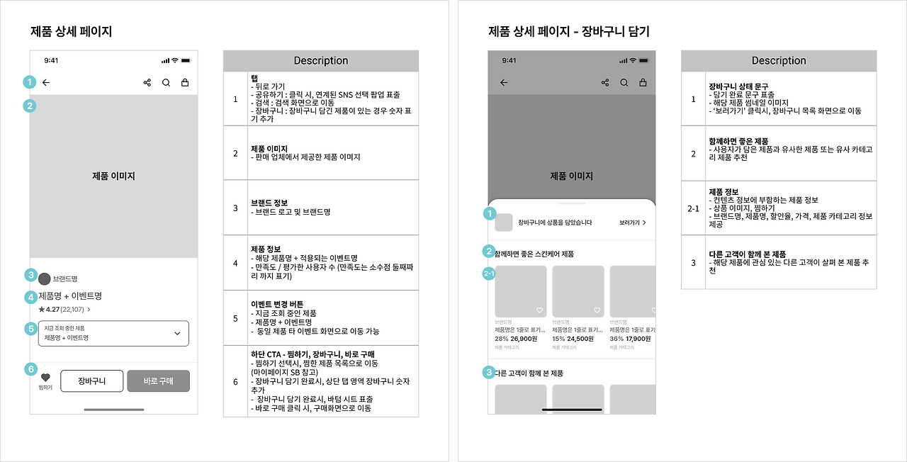 - 장바구니 담기 완료 시, 추천 제품 정보 제공 : 같은 카테고리 제품 정보 및 다른 고객이 본 제품 정보 제공