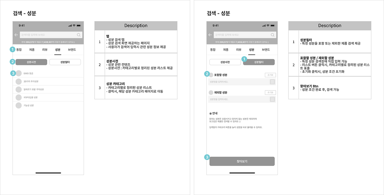 성분 탭 : 기존의 성분사전 성분필터 화면 통합 및 성분 탭 하위 메뉴로 정리