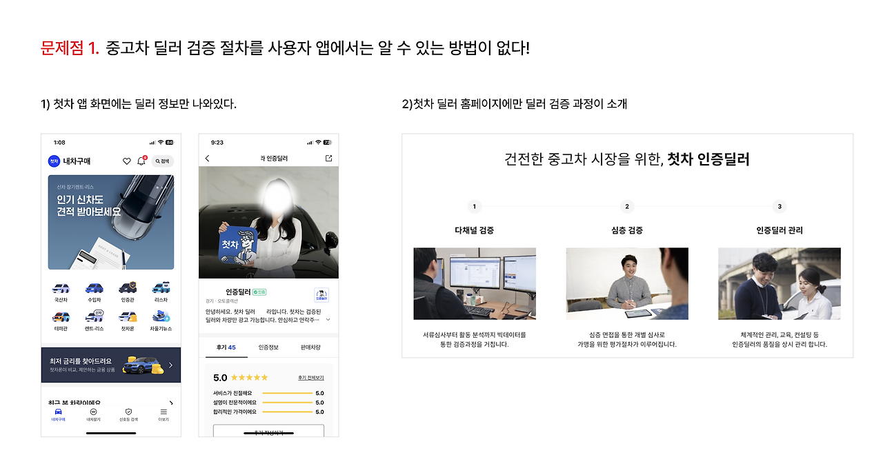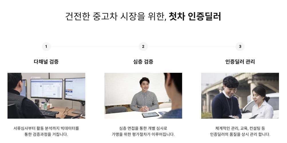 서류심사부터 활동 기록까지 빅데이터를 통해 검증하고 직접 심층 면접과 개별 심사까지 꼼꼼한 검증 걸쳐를 거쳐 딜러를 등록하고 있는 첫차. 하지만 아쉽게도 이 과정을 사용자들이 확인할 수 있는 방법은 없었다.