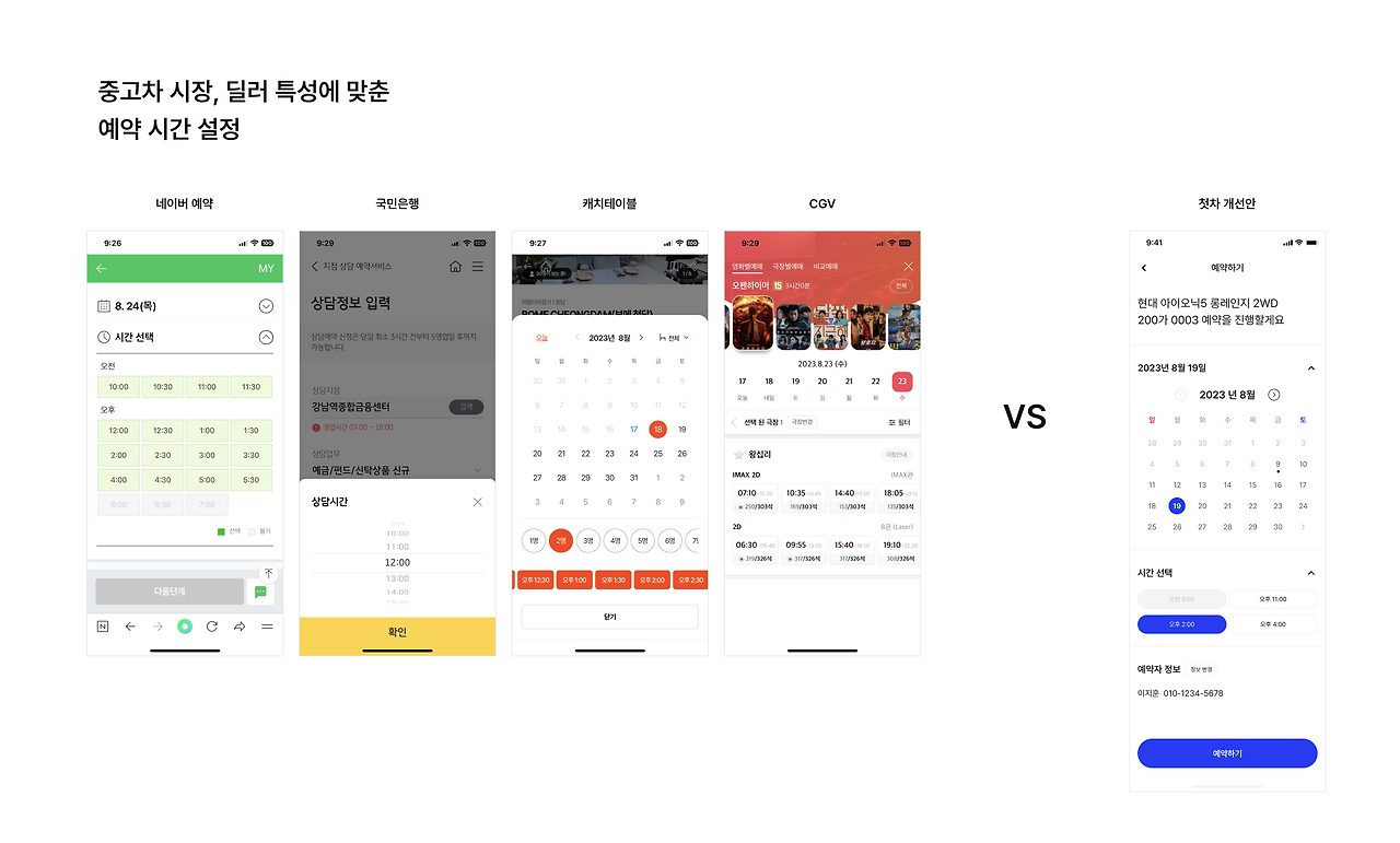한 가지 특징이 있다면 첫차의 간편 예약 시스템은 미용실, 은행, 식당 등의 예약 서비스와는 다르게 예약 시간 슬롯 (Slot)이 적은걸 볼 수 있는데, 이는 잦은 손님 상대와 외근 등이 많은 딜러와 중고차 매장의 특성을 반영한 것이다.