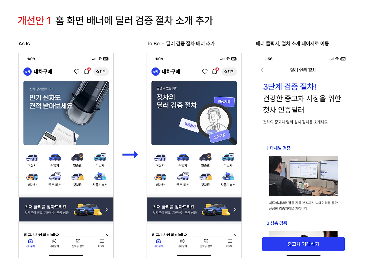 따라서 아래 이미지와 같이 서비스 개선안을 제안해보려 한다. 홈화면 상단 배너에 '첫차의 딜러 검증 절차'를 추가하고, 클릭 시 기존에 딜러 홈페이지에만 소개되어 있는 딜러 검증 절차 프로세스를 알려주는 페이지로 연결된다. 그리고 하단에는 '내차 구매'로 이어지는 CTA 버튼을 추가하여 바로 서비스를 이용을 유도할 수 있도록 구성하였다.