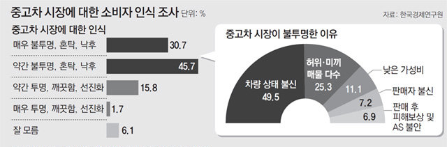 하지만 시장의 규모가 커지고 있음에도 소비자들의 만족도는 매우 낮은 것을 알 수 있는데, 한국경제연구원과 동아일보의 기사에 따르면 응답자의 75% 이상이 중고차 시장이 불투명하고, 혼탁하고, 낙후되었다고 응답했다.