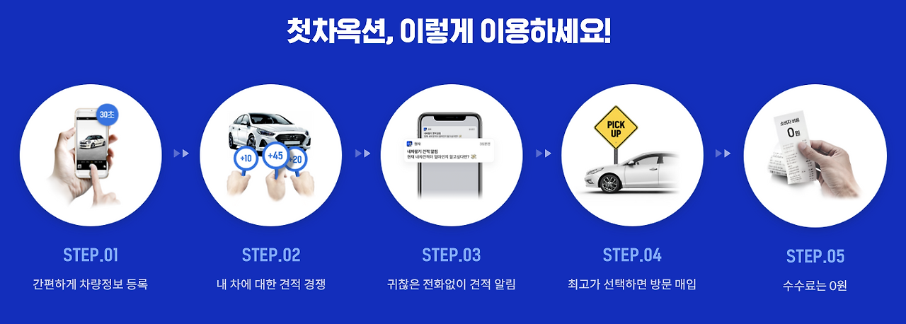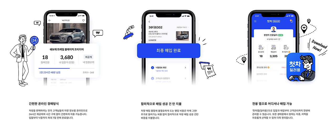 내 차종, 연식과 주행 거리, 옵션 정보와 사진 등 기본적인 정보를 등록하면 첫차에서 활동하고 있는 딜러들에게 전달이 된다. 딜러들은 24시간 동안 가격 입찰을 할 수 있으며 판매자는 들어온 입찰 견적을 보고 최고가를 선택하면 된다. 이 과정에서 전화나 문자 등 번거로운 과정은 없다. 차량을 처분하기 위해 동분서주 발품 뛰어야 했던 기존 시장의 번거로움을 첫차에서는 앱 하나로 간편하게 해결해주고 있는 것이다.