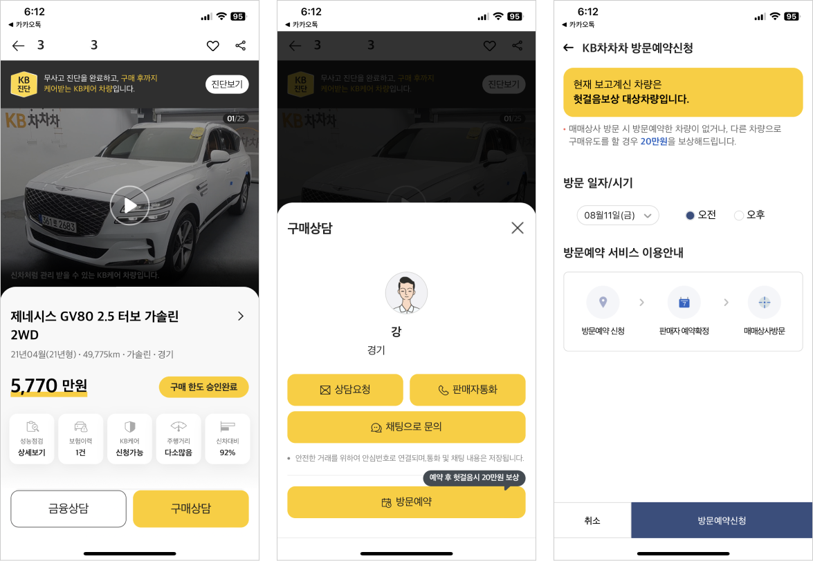 방문예약은 고객이 방문예약 신청을 하면 딜러는 예약 일정을 확인후 확정 처리를 하고, 예약 당일에 방문하여 상담과 거래를 진행하게 되는 프로세스이다. 고객들은 간편 예약 기능으로 불필요한 연락을 피하고 또 매장 방문시의 대기 시간을 줄일 수 있게 되고 딜러들은 앱 하나로 고객 일정을 관리하고, 예약을 하고 방문하지 않는 노쇼도 줄일 수 있게 되면서 질 높은 고객 대응을 할 것이라 예상된다. 또 KB차차차에서는 예약 방문 데이터를 통해 방문 성사, 거래 성사 등의 데이터를 파악하고 수집할 수 있어 추후 서비스 디벨롭에 도움을 줄 수 있을 것이다.