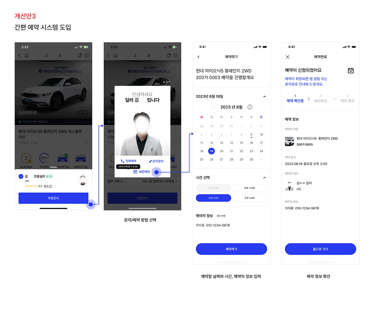 위의 내용을 반영하여 아래와 같이 '간편 예약 시스템'을 제작하였다. 사용자는 기존의 전화예약, 문자문의와 더불어 방문예약을 선택할 수 있다. 방문예약을 선택하면 원하는 날짜와 시간을 선택하여 예약할 수 있으며 사용자가 예약을 하면 딜러가 예약 확정을 하고 예약 당일 매장에 방문하는 구조로 설계하였다.