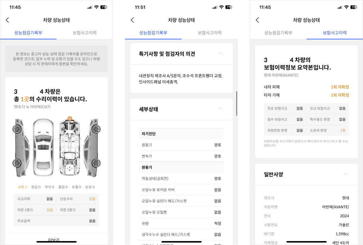 성능점검기록부 화면에서 어떤 부분에 수리를 했는지, 수리는 어떤식으로 진행했는지 확인할 수 있으며 차량 상태를 검수한 기사님의 종합 의견을 통해 기타 특이 사항 여부를 알게됨과 동시에 '꼼꼼하게 검수했구나'라는 심리적 안도감을 얻을 수 있다.