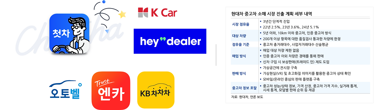이러한 시장의 문제점을 해결하고자 '첫차'를 비롯하여 '헤이딜러', '케이카' 등 기존 소비자들이 느끼던 불편함을 덜어주고 신뢰도를 높인 플랫폼들이 등장하면서 시장 점유율을 공격적으로 높여가고 있다. 또한 지난 3월 중소벤처기업부 생계형 적합업종 심의위원회는 대기업의 중고차 소매업 진출에 대해 허용하기로 결의하였다. 현대차 등 대기업이 중고차를 일반 개인에게도 직접 판매 가능한 채널이 열리게 된 것이다.