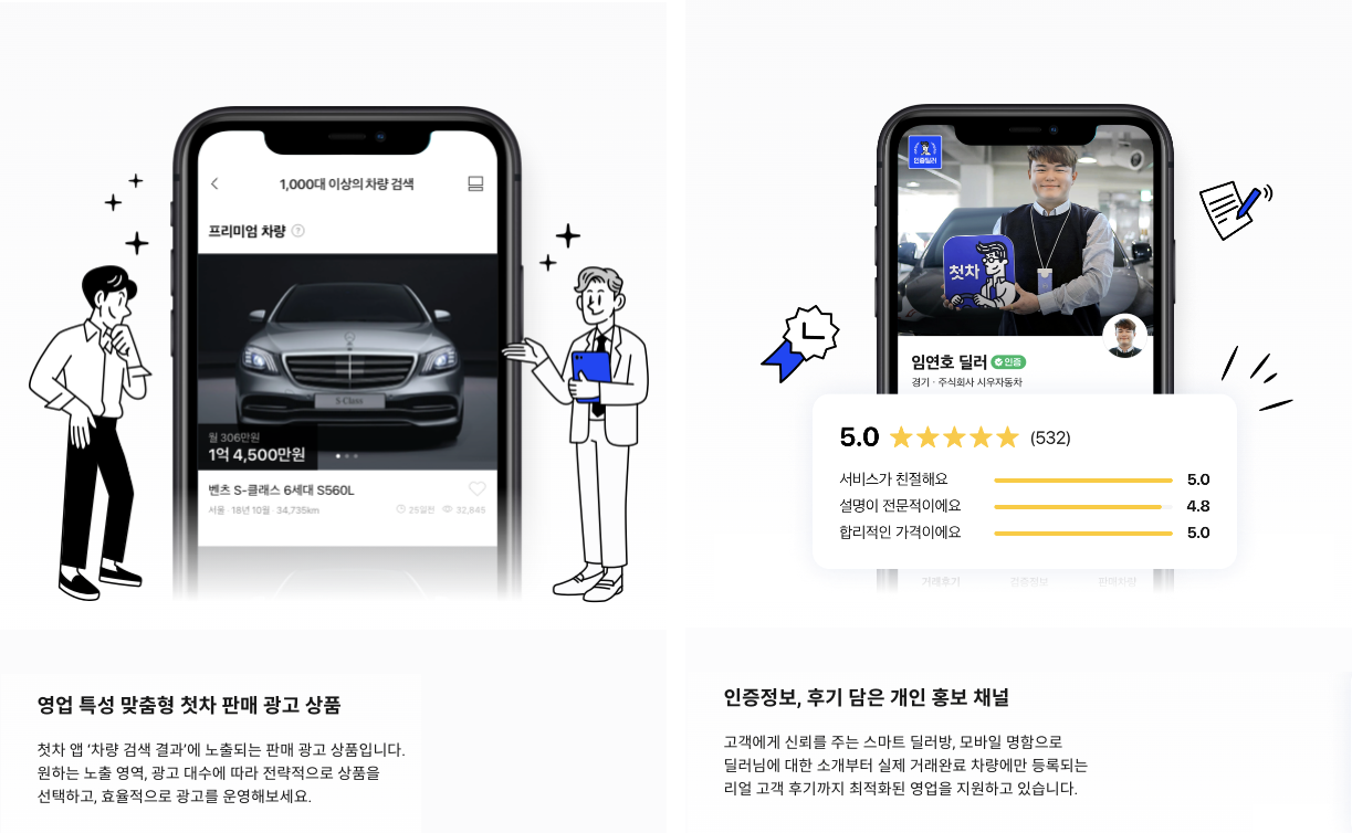 또한 딜러 역시 첫차에 등록하게 되면 원하는 차량, 대수에 따라 효율적인 광고 운영을 할 수 있고 인증 정보와 고객 후기들을 통해 개인 홍보 채널로도 활용할 수 있다는 장점이 있다. 홍보와 마케팅, 고객 관리에 어려움을 겪었을 딜러들의 불편함도 한 번에 해결해주고 있는 것이다.
