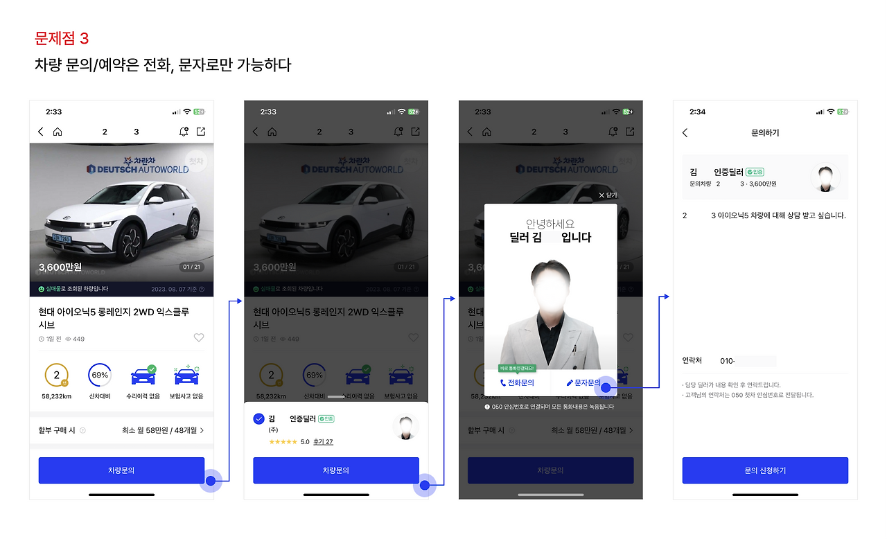 사용자는 첫차에서 상세한 차량 정보와 딜러 정보를 확인 한 뒤 마음에 들고 안심이 되면 차량 구매를 위해 문의와 예약 단계로 넘어간다. 한 가지 아쉬운 점은 차량 문의와 예약을 하기 위해서는 전화 또는 문자로 연락을 하는 방법밖에 없다는 것이다. 전화와 문자로도 충분히 상담과 예약이 가능하지만, 시스템으로 구축해놓으면 어떨까?