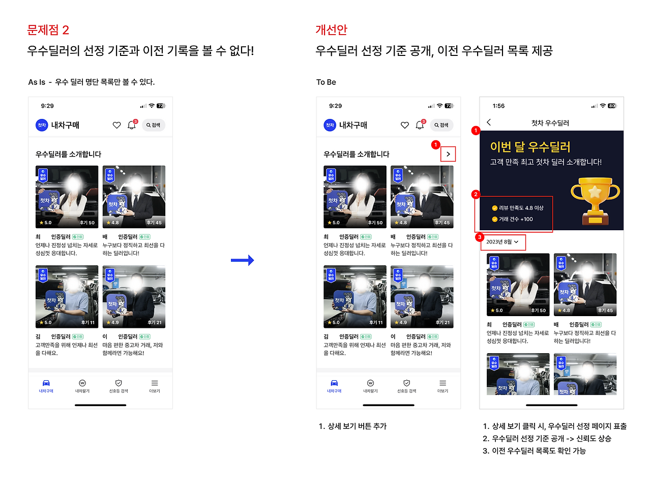 그래서 위 개선안과 같이 우수딜러 상세 보기 버튼을 추가하였고 클릭 시, '첫차 우수딜러' 페이지로 이동하게 된다. 페이지 상단에 우수딜러 선정 기준(*첫차의 실제 선정 기준을 확인할 수 없어, 임의로 추측하여 기재) 을 알려주는 영역을 추가하였으며 우수딜러 목록에는 이전에 선정된 딜러 목록도 볼 수 있도록 '날짜 선택' Dropdown을 넣었다.