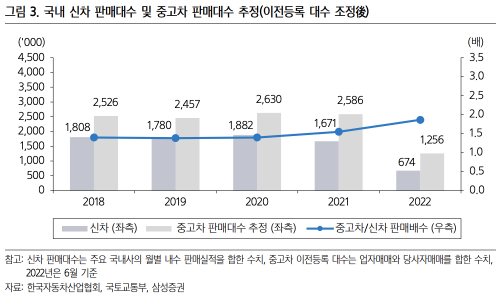 차량용 반도체 등 부품 공급의 불안정, 완성차 출고 지연, 치솟는 물가 등으로 인하여 중고차 시장은 날이 갈수록 커지고 있다. 연간 신차 판매대수 약 170만대인 반면, 중고차 판매대수는 약 260만대로 신차대비 1.4배의 거래량을 보이고 있다.