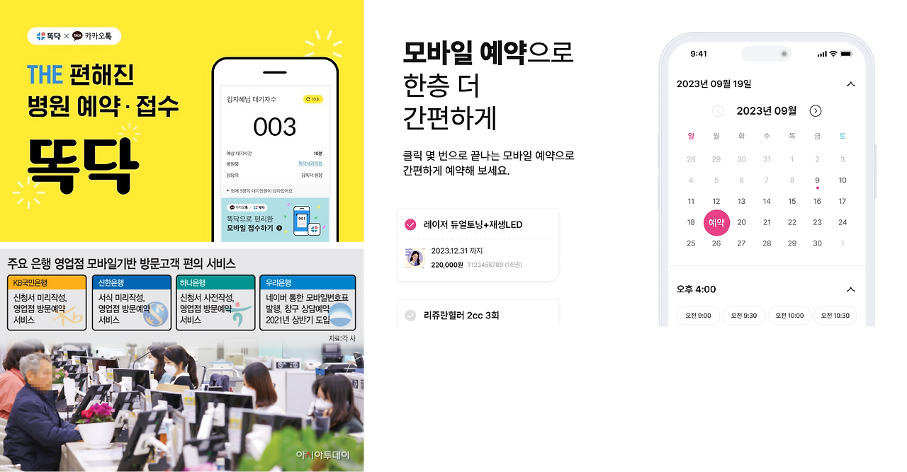 이러한 트렌드에 맞춰 사용자들의 편리성을 위해 다양한 분야의 서비스들이 비대면 예약 기능을 추가하고 있다. 비대면 진료, 헬스케어 서비스인 똑닥은 비대면 예약 기능으로 병원 진료 전에 미리 예약과 접수를 할 수 있어 환자들의 병원 대기 시간을 줄이고 있고 우리나라 대표 피부과 플랫폼인 여신티켓도 모바일 예약 기능으로 피부과 진료 시 불필요한 상담 절차를 줄임과 동시에 병원 대기 시간을 줄여주고 있다. 또한 똑딱과 여신티켓에 입점해 있는 병원들 역시 수 많은 환자들의 예약 전화와 상담을 받지 않아도 된다는 간편함과 플랫폼으로 예약되는 회원의 데이터를 토대로 효율적인 고객 운영이 가능하다는 장점이 있다.