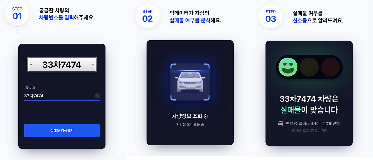 차량 번호를 검색하면 첫차의 빅데이터 기술이 빠르게 분석하여 정상적인 절차를 거쳐 등록된 실매물인지, 여러가지 요인으로 인한 주의 차량인지 또는 허위매물 차량으로 조심해야 하는지 알려준다.