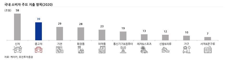 위에서 언급한바와 같이 중고차 시장은 꾸준히 성장하며 중고차 시장은 우리 삶에서 빼놓을 수 없는 요소가 되었다. 유진투자증권의 2020년 자동차 이슈 보고서에 따르면 국내 소비자의 주요 지출 항목 2위가 '중고차'로 나타났다. 거래상 매입/매도의 중복을 제거하더라도 28조 내외의 규모로 추산될 정도로 어마어마한 규모를 형성하고 있다.
