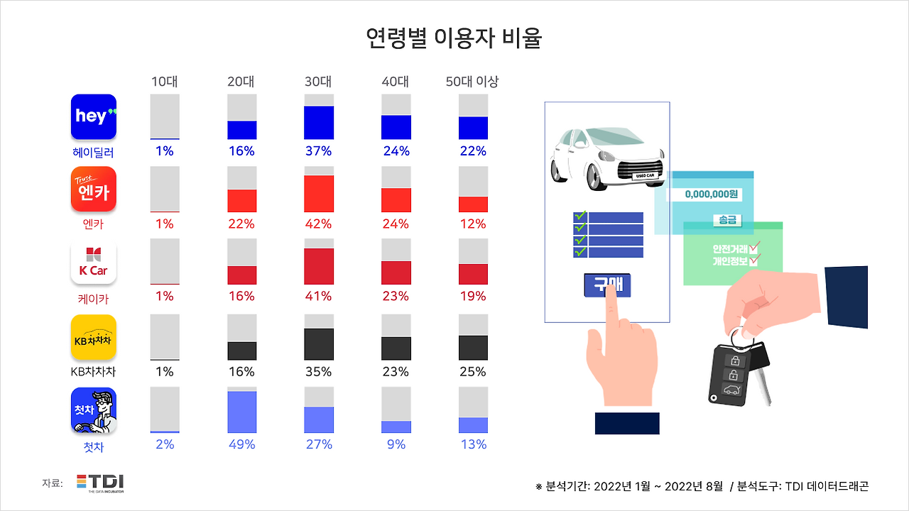 기사에는 20대 이용 비율이 높은 원인이 언급되지는 않지만 개인적으로는 '첫차'라는 서비스 이름에서 오는 브랜드 이미지, 두 창업자의 서비스 런칭 계기와 서비스 비전, IT 기술을 바탕으로 기울어진 운동장이었던 중고차 시장의 정보 불평등을 해소하고자 하는 기능이 첫 차량 구매를 중고차로 하려는 차에 대해서 아직 잘 모른느 2030세대, 사회 초년생들에게 크게 다가왔기 때문이라 생각한다.