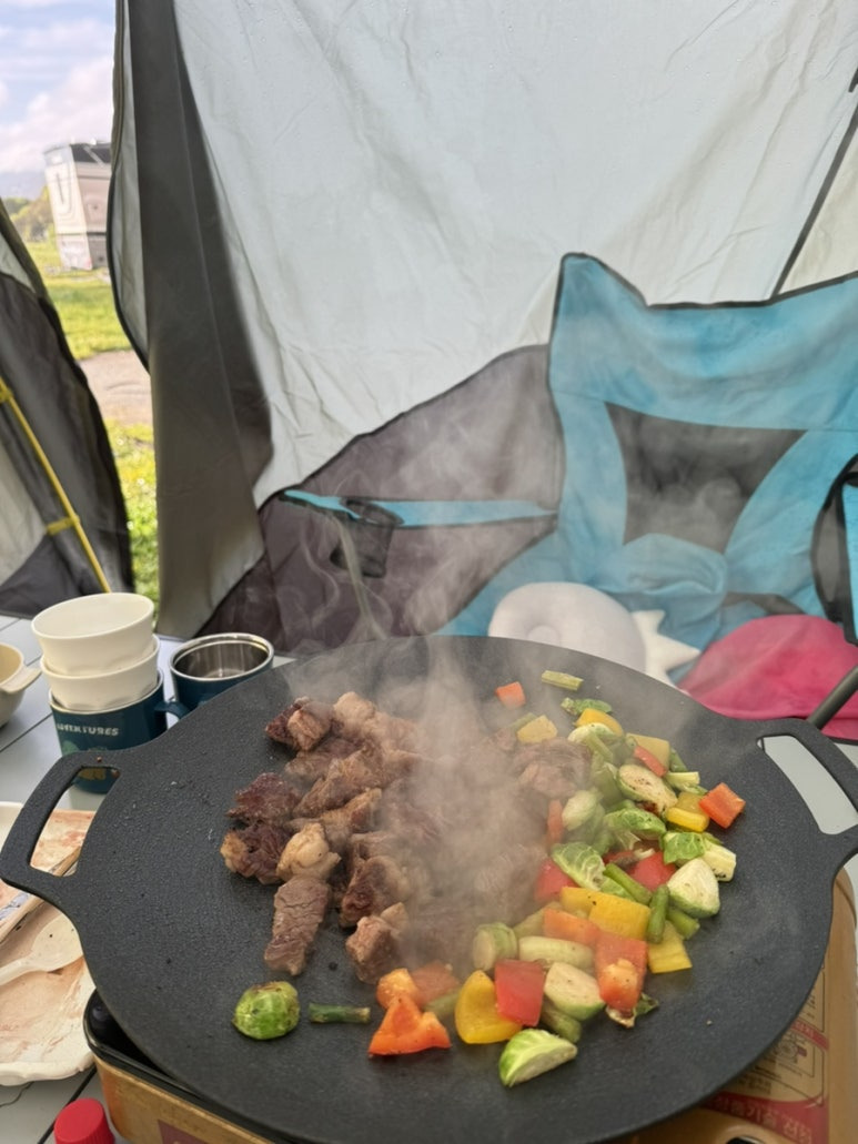 정말 쉽지 않다. 하필 바다 앞이라 모든 것이 좋았지만 바람이 너무 불어서 테이블에 뭘 맘 놓고 먹을 수가 없었다. 잘 먹다 보면 무언가 날아가 잡으러 가기 일쑤. 그래도 고기랑 주꾸미도 구워 먹고 밥까지 볶아먹음.