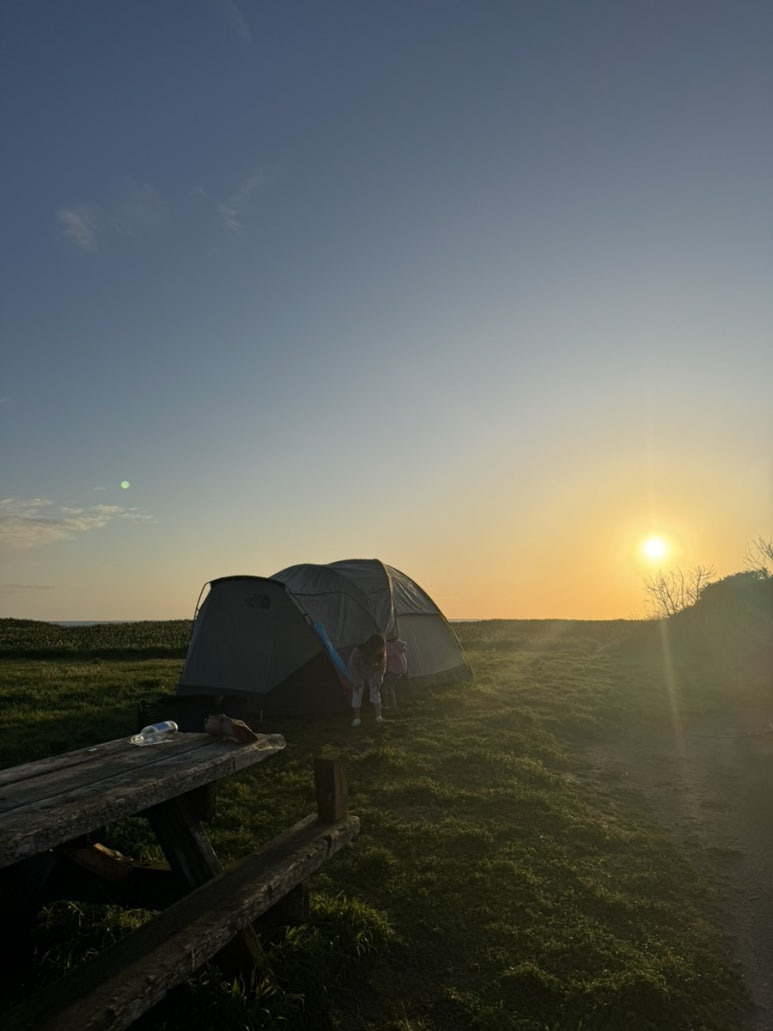 우리 가족 네 명의 무게 때문에 날아가지 않은 거 같다. 정말 첫 개시지만 우리 텐트의 성능을 증명함.