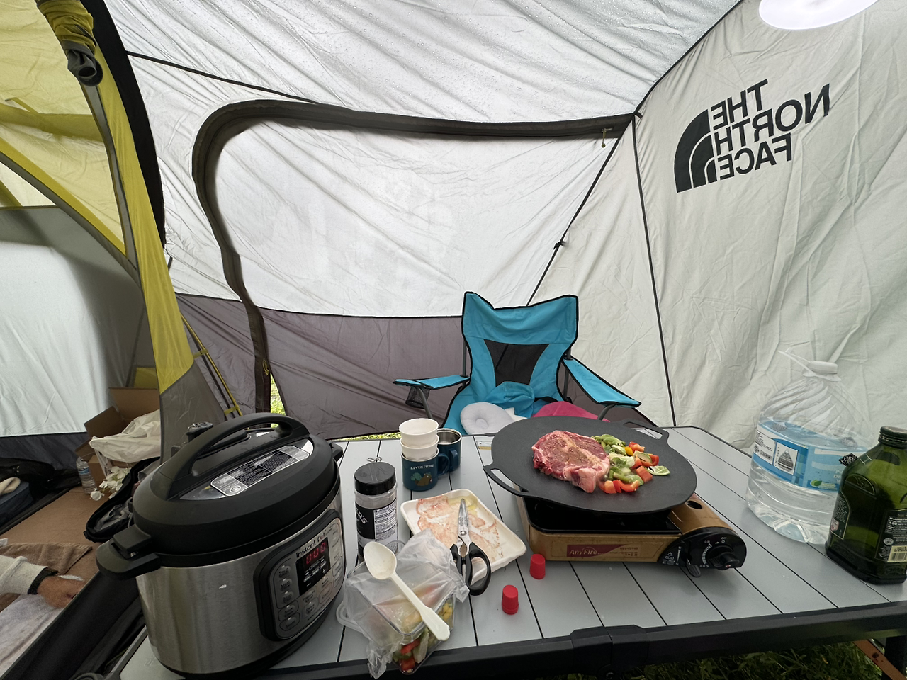 저녁엔 다시 비가 조금씩 내려 텐트 안에 들어와 저녁 먹었다. 아까 peet's커피에 갔을 때 Safe way에서