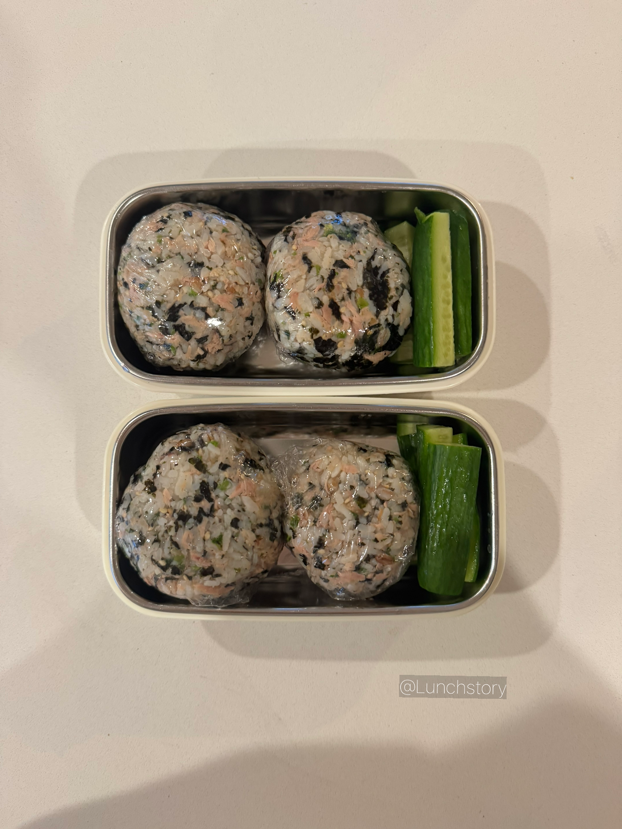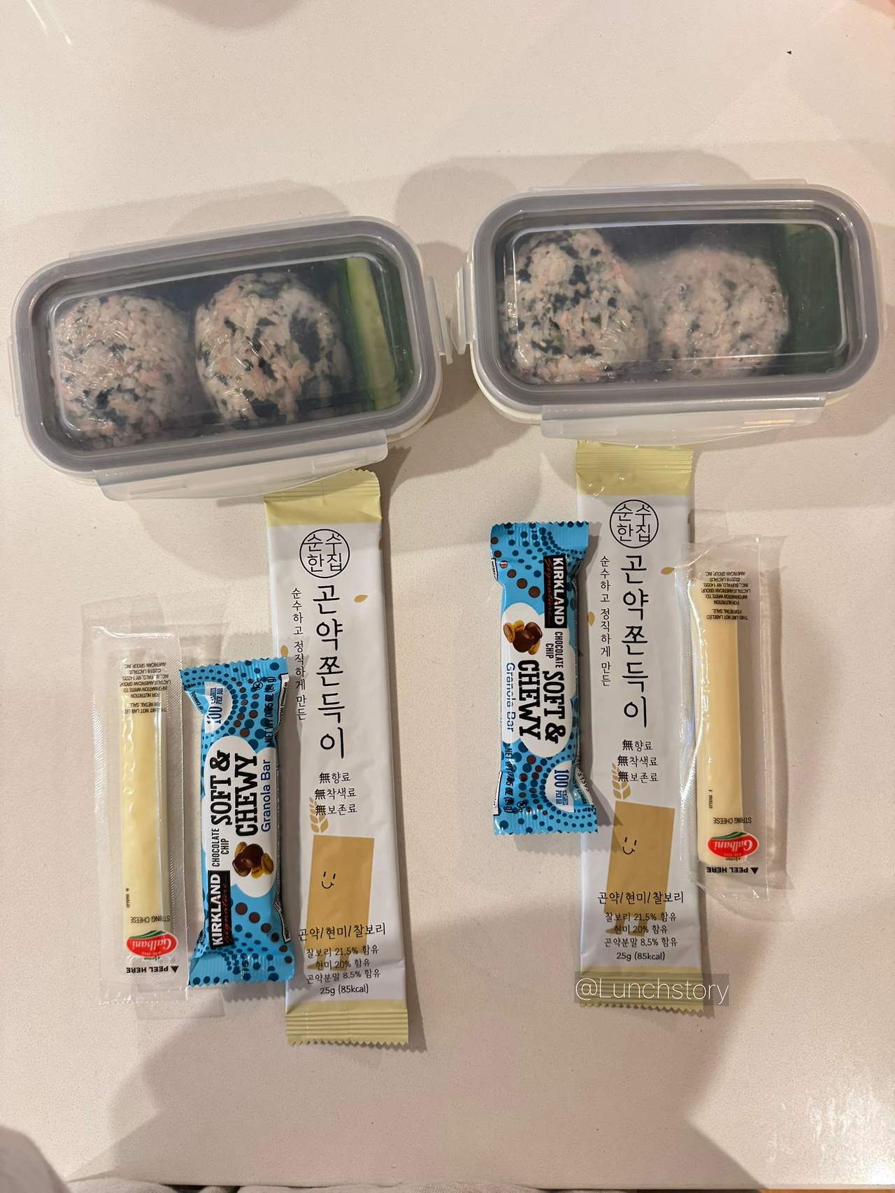 참치 주먹밥과 오이. 스낵은 에너지바 등등