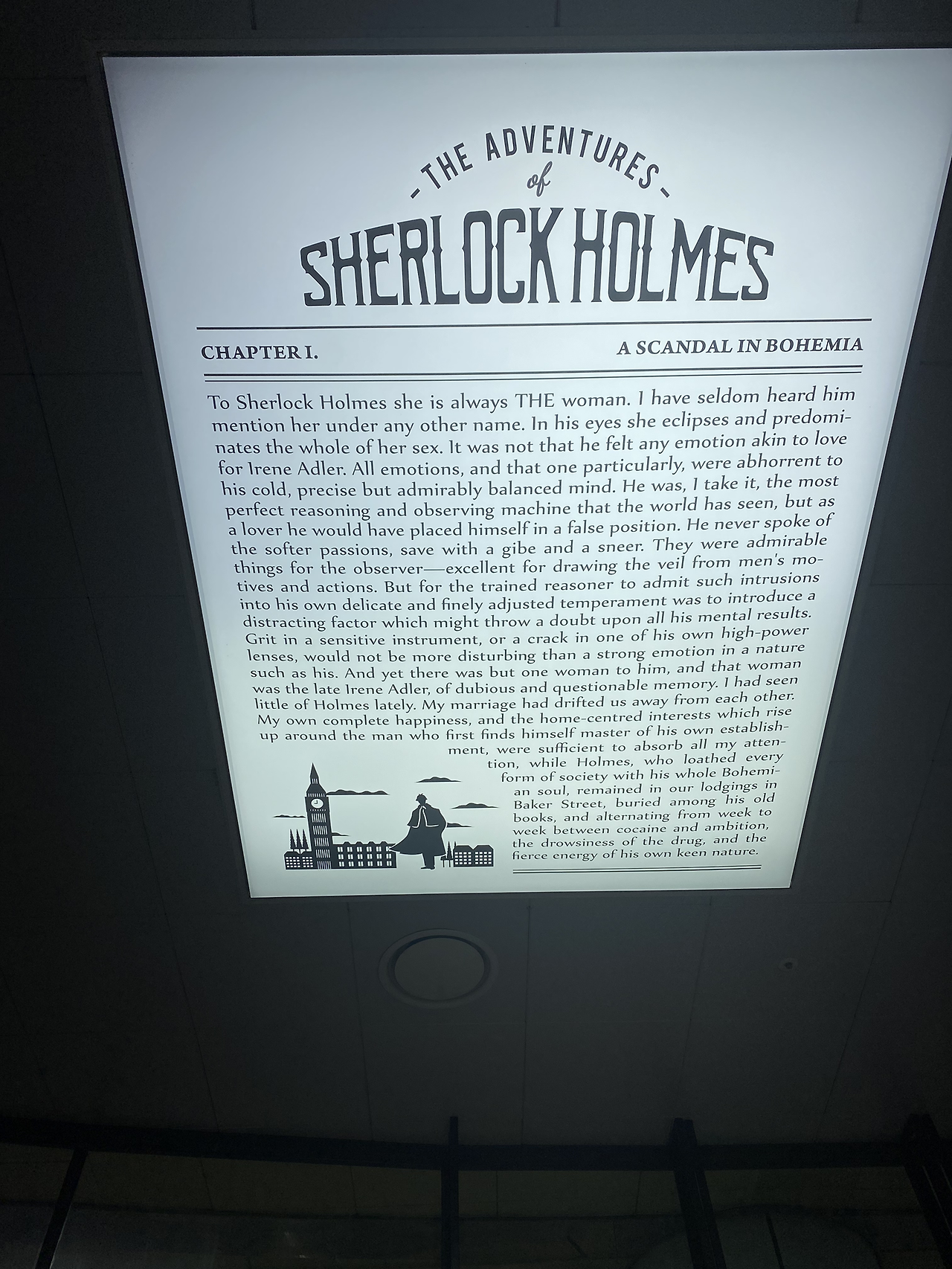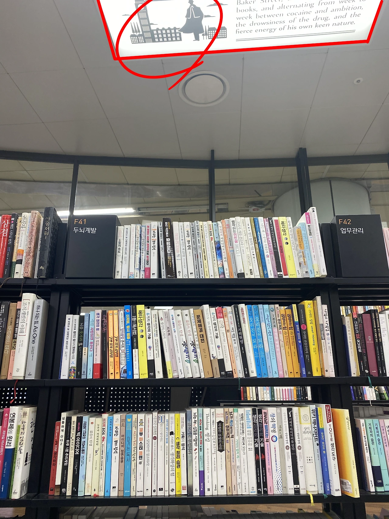 지인과 약속시간에 보다 빠르게 도착하여 평소처럼 주변 카페에서 10분 - 20분 정도 시간을 보낼 예정이었습니다. 그런데 지하철에서 내려 출구로 향하는 와중 역사 안에 “중고서점”이 있어서 평소와 다른 곳에 발길을 멈추게 되었습니다. 이 책 저책을 살펴보다가 책장 앞에 서있는데 제 시야에 알 수 없는 그림이 하나가 보이는 겁니다. 그래서 자연스럽게 그림을 따라서 눈을 돌려보니, 셜록홈즈의 내용(?)이 짧게 있었습니다.