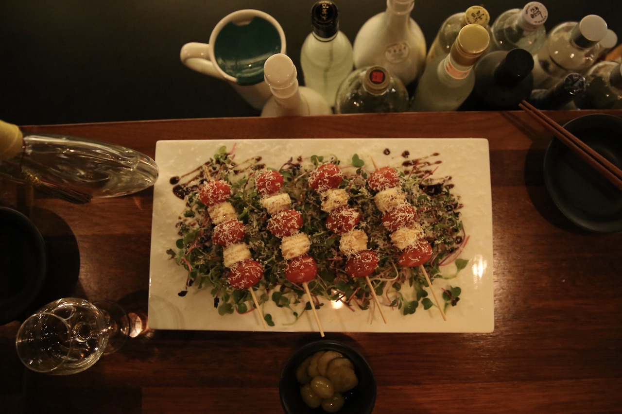 ('작'에서는 육전, 피문어초회 같은 전통 안주 이외에도 카프레제, 치즈볼 등의 타국 안주들도 많다.)