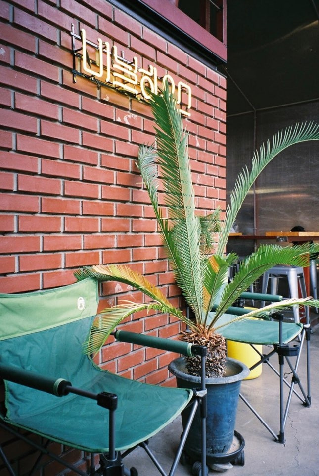 카운터 바로 앞에 설치된 파라솔을 봐도 내부인 것 같기도 외부인 것 같기도 하다. 외부에 있을 법한 요소를 내부에 가져옴으로써 한층 더 실외 같은 실내를 만든다. 빨간 파라솔에 앉아 음료를 마시는 사람들은 보고 있으니 편의점 앞 풍경을 옮겨 놓은 듯하다. 2층 다락과 카페 곳곳에 놓인 캠핑용 의자도 맥락을 같이한다.