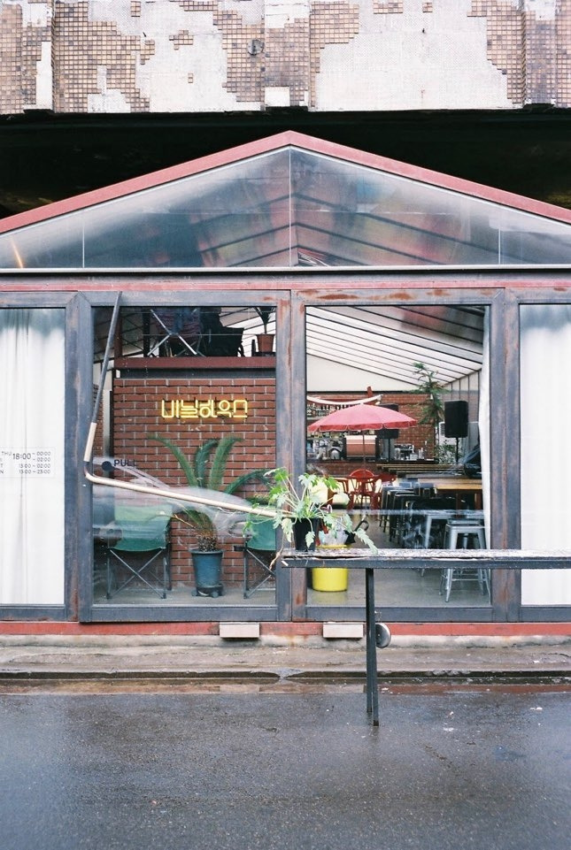 인더스트리얼 디자인, 노출 콘크리트, 공장 느낌의 카페들은 이제 꽤 흔하다. 그러나 비닐하우스가 기존의 그것들과 같지 않은 점은 철공소의 동네에서 가장 잘 어울리는 재료를 이용해 새로운 집을 만들었기 때문이다. 그저 그런 인더스트리얼 느낌의 카페로 정의하기엔 단정한 집 같아 보이고 새로운 카페라기엔 날 것 같아 보인다.