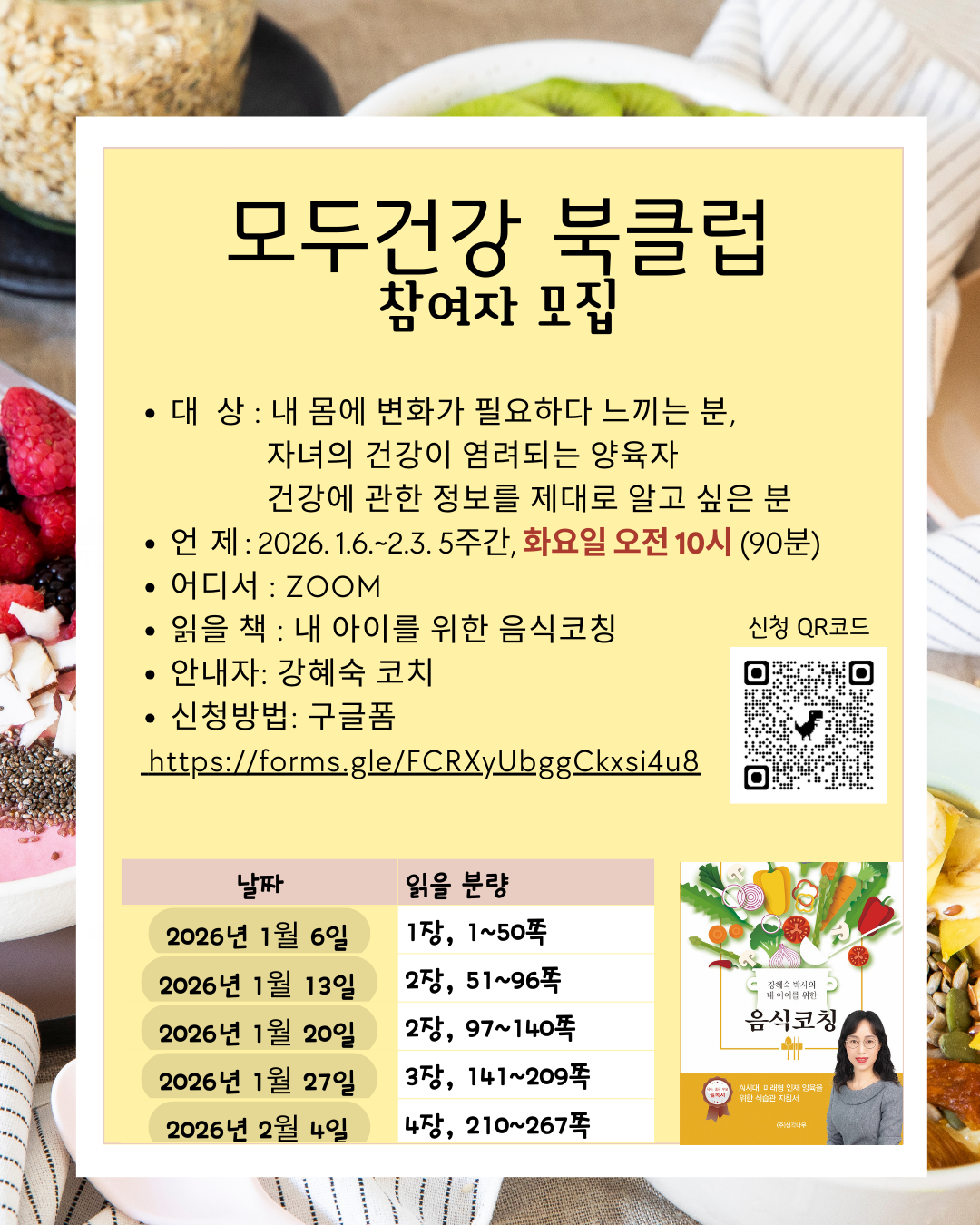 - 읽을 책 : 내 아이를 위한 음식코칭 매주 일정 분량을 읽고 참여합니다.