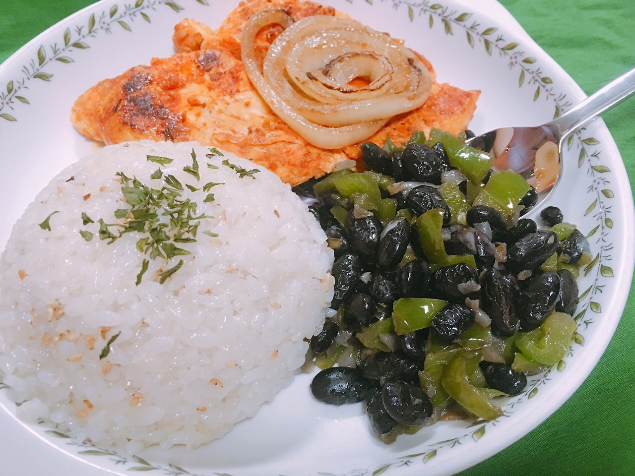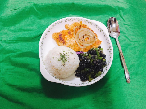 준비물: 닭가슴살, 양파, 흰 쌀밥, 검은콩, 피망, 카옌 페퍼, 라임, 후추, 파슬리, 다진 마늘, 소금, 깨