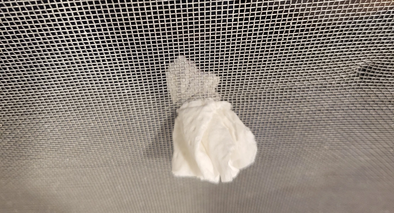 고약하게도 구멍 난 방충망에 두루마리 휴지를 돌돌 말아 끼워 두었다. 지독하다.