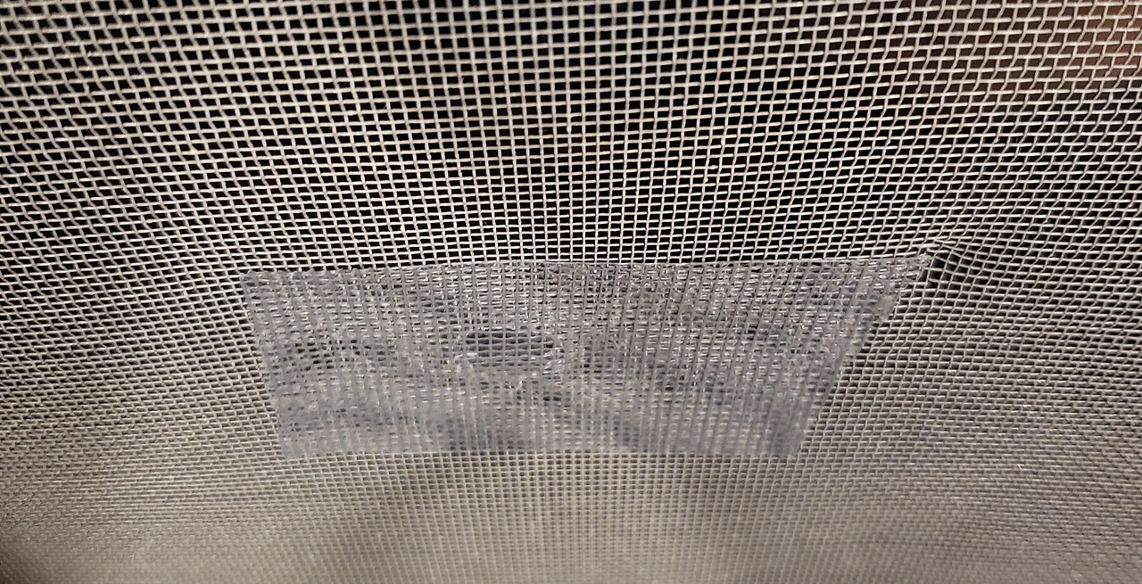 구멍 난 곳 보다 넉넉하게 방충망 테이프를 잘라 붙였다. 꼼꼼하게 매만져 떨어지지 않게 잘 붙인다. 이제 저 접착면은 콩 벌레 끈끈이 혹은 달동네 팅커벨 끈끈이 역할을 하게 될지도 모른다. 잘라낸 남은 방충망 테이프를 직사각형으로 잘라 창틀 물구멍에 몇 군데 붙였다. 아, 이건 물 투과가 되지 않는 재질이다.